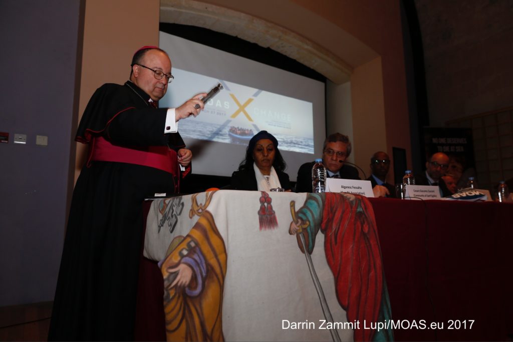 The Archbishop blesses a flag for MOAS sea vessel