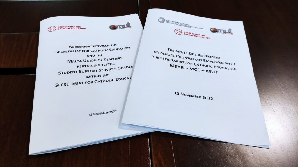 The Secretariat for Catholic Education today signed an agreement with the Malta Union of Teachers (MUT) to cover those engaged as Student Support Services Grades.