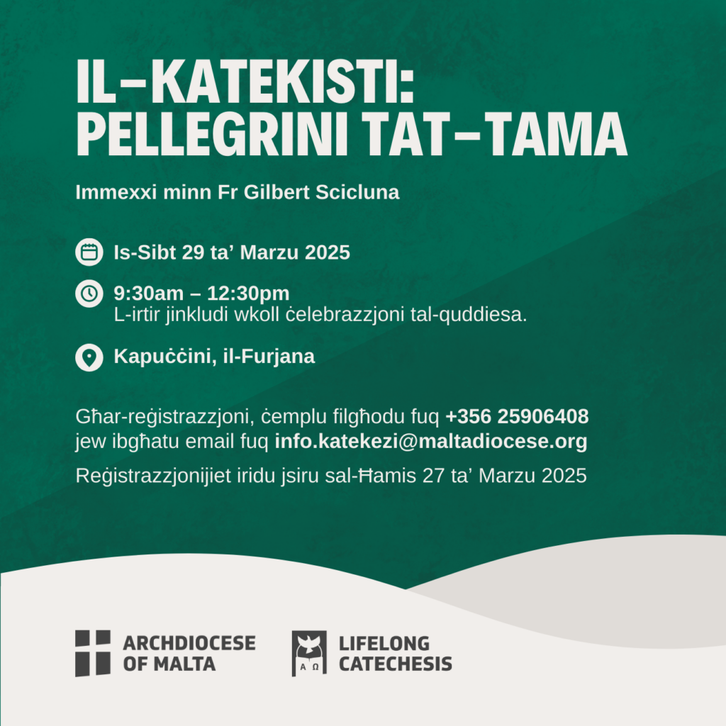 The Ministry for Lifelong Catechesis is organising a retreat for catechists, led by Fr Gilbert Scicluna. During the retreat, participants will have the opportunity to reflect, pray, and share experiences that are essential to their ministry. Fr Gilbert will offer a reflection on how catechists can live their mission as Pilgrims of Hope, within the context of service and faith.