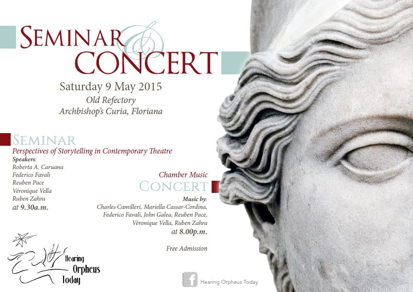 A seminar and a concert on Maltese contemporary music – Contemporary composers diffuse the voice of OrpheusThe events will be held in the Old Refectory, Archbishop Curia – Floriana.Hearing Orpheus Today is a musical event which consists of a seminar and a concert that will both be held on Saturday 9th May in the Old Refectory at the Archbishop’s Curia in Floriana. This will be a one-time opportunity for all participating composers to come together and discuss their views about contemporary theatre. The two-hour seminar will start at 9.30am. In the evening, at 8pm, a concert featuring chamber music will be held. Local and foreign musicians, who will be in Malta for this occasion, will perform during this concert, in a venue of great artistic quality. The general public is invited to attend.