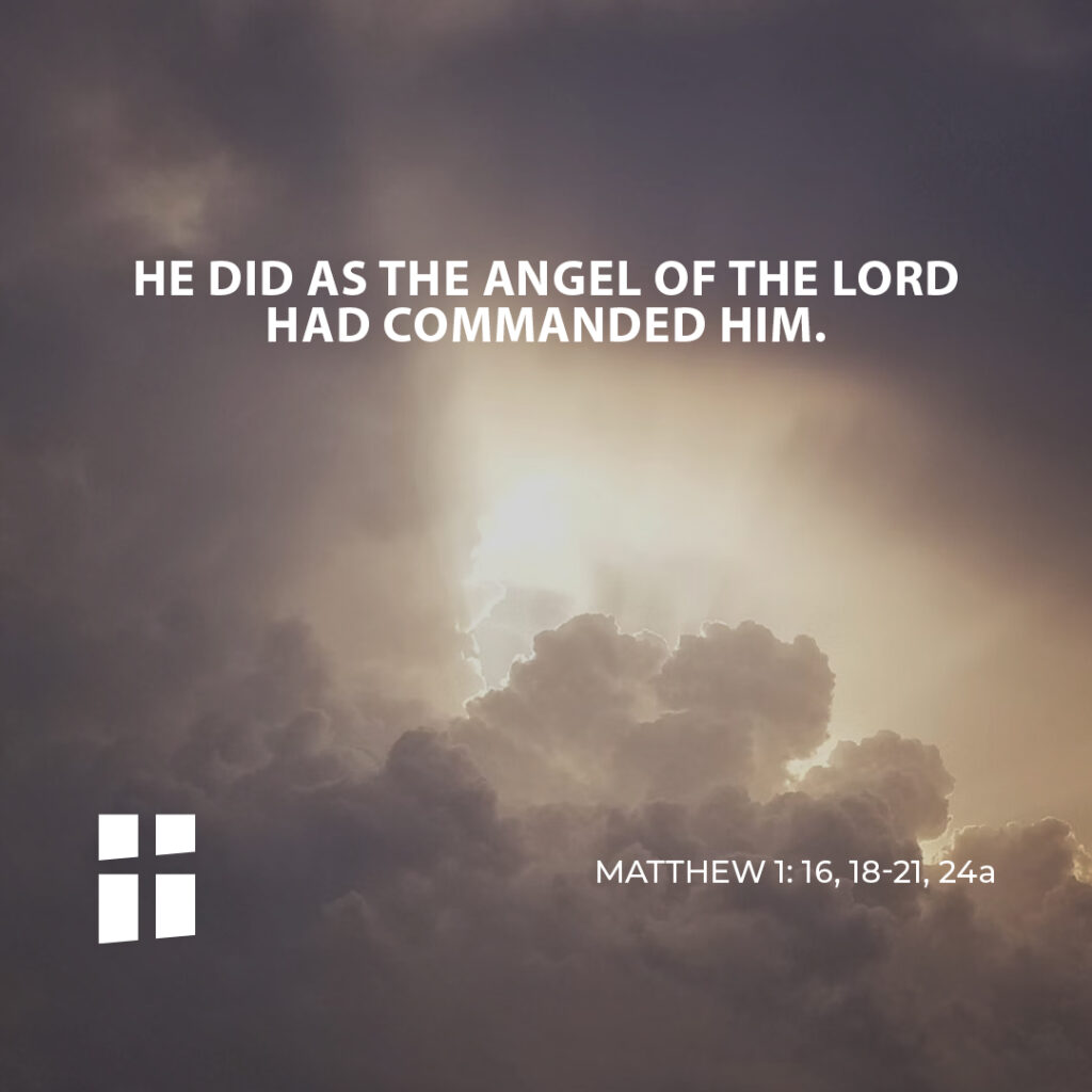 Such was his intention when, behold, the angel of the Lord appeared to him in a dream and said, “Joseph, son of David, do not be afraid to take Mary your wife into your home. For it is through the Holy Spirit that this child has been conceived in her. She will bear a son and you are to name him Jesus, because he will save his people from their sins.” When Joseph awoke, he did as the angel of the Lord had commanded him and took his wife into his home.