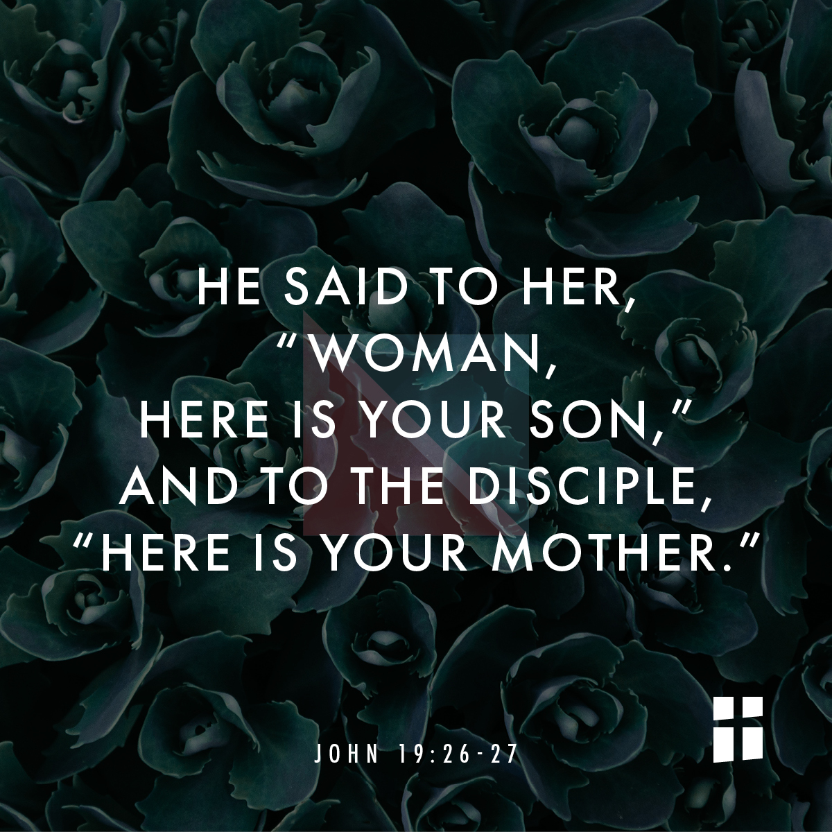 There were standing by the cross of Jesus his mother, and his mother’s sister, Mary the wife of Clopas, and Mary Magdalene. Therefore when Jesus saw his mother, and the disciple whom he loved standing there, he said to her, “Woman, here is your son!” and to the disciple, “Here is your mother!” From that hour, the disciple took her to his own home.
