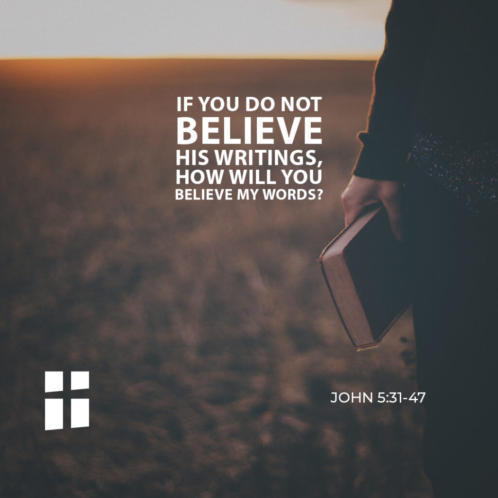 How can you believe, when you accept praise from one another and do not seek the praise that comes from the only God? Do not think that I will accuse you before the Father: the one who will accuse you is Moses, in whom you have placed your hope. For if you had believed Moses, you would have believed me, because he wrote about me. But if you do not believe his writings, how will you believe my words?”