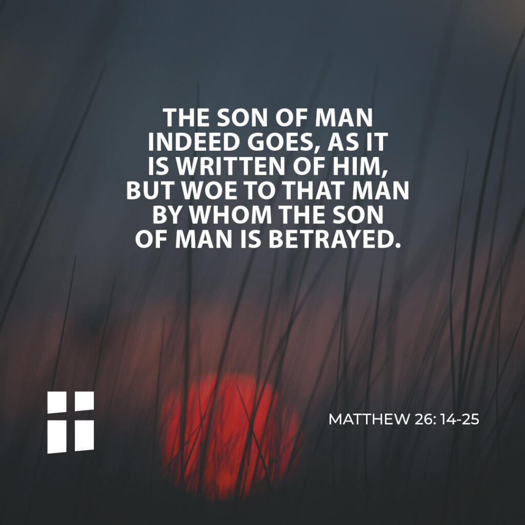 The disciples then did as Jesus had ordered, and prepared the Passover. When it was evening, he reclined at table with the Twelve. And while they were eating, he said, “Amen, I say to you, one of you will betray me.” Deeply distressed at this, they began to say to him one after another, “Surely it is not I, Lord?” He said in reply, “He who has dipped his hand into the dish with me is the one who will betray me. The Son of Man indeed goes, as it is written of him, but woe to that man by whom the Son of Man is betrayed. It would be better for that man if he had never been born.” Then Judas, his betrayer, said in reply, “Surely it is not I, Rabbi?” He answered, “You have said so.”
