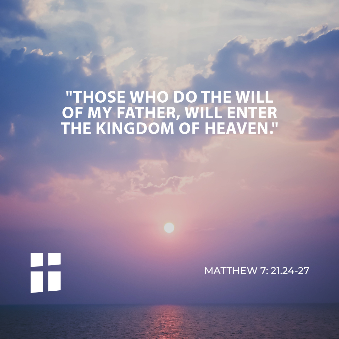 In those days, Jesus told his disciples: “Not everyone who says to me, “Lord, Lord,’ will enter the kingdom of heaven, but only the one who does the will of my Father in heaven. Everyone then who hears these words of mine and acts on them will be like a wise man who built his house on rock. The rain fell, the floods came, and the winds blew and beat on that house, but it did not fall, because it had been founded on rock. And everyone who hears these words of mine and does not act on them will be like a foolish man who built his house on sand. The rain fell, and the floods came, and the winds blew and beat against that house, and it fell—and great was its fall!”