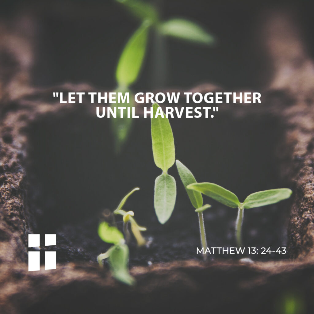 He answered, ‘An enemy has done this.’ His slaves said to him, ‘Do you want us to go and pull them up?’ He replied, ‘No, if you pull up the weeds you might uproot the wheat along with them. Let them grow together until harvest; then at harvest time I will say to the harvesters, “First collect the weeds and tie them in bundles for burning; but gather the wheat into my barn.”‘”