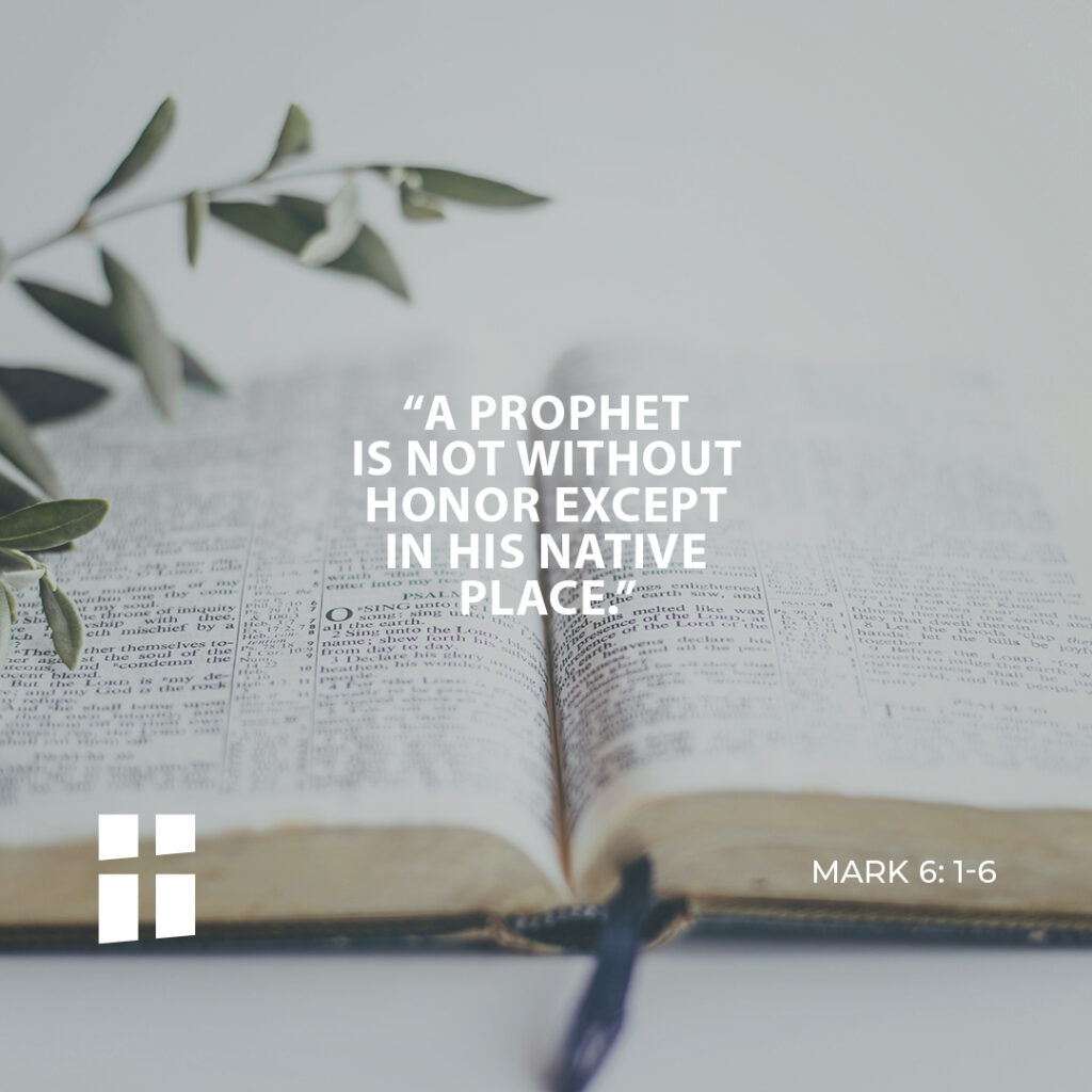 Jesus said to them, “A prophet is not without honor except in his native place and among his own kin and in his own house.” So he was not able to perform any mighty deed there, apart from curing a few sick people by laying his hands on them. He was amazed at their lack of faith.